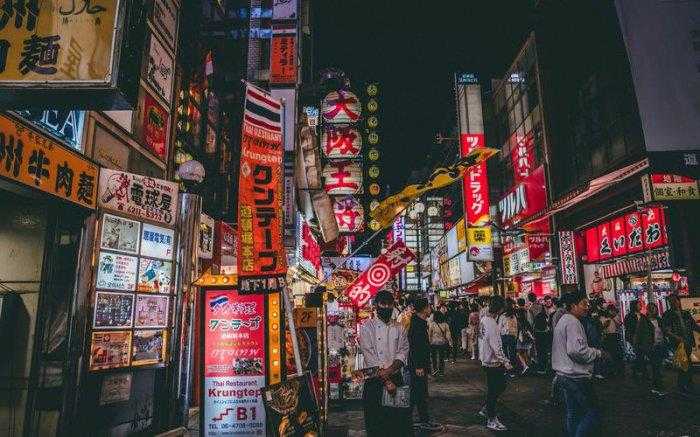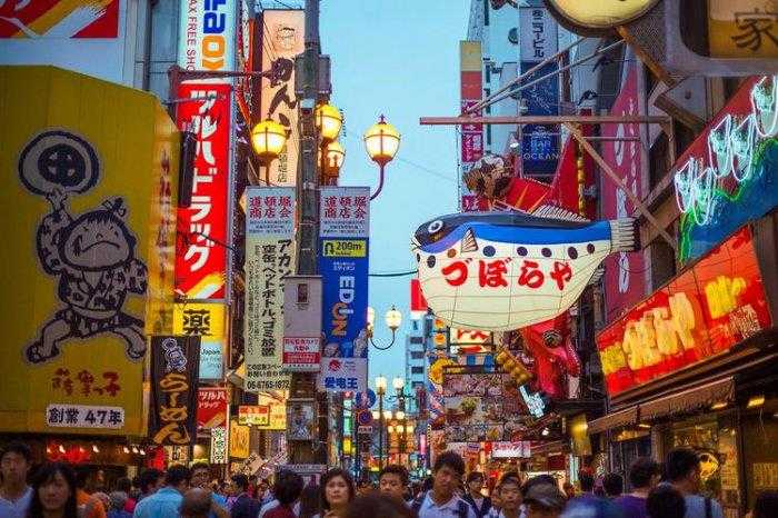 道顿堀是大阪的美食街,云集了众多老字号餐厅和小吃摊,以大型霓虹灯标志和奇特的氛围闻名,夜晚灯光璀璨,热闹非凡。