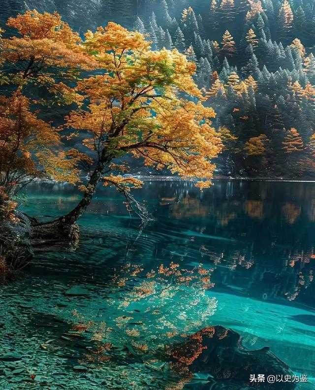 自然奇观:第四纪冰川雕琢出钙化瀑布与碧蓝海子,秋日五彩林倒映水面,被诗人肖草赞为“九寨归来不看水”。