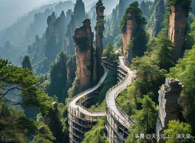 景区亮点:3000 多根石英砂岩峰柱拔地而起,袁家界乾坤柱、天门山玻璃栈道、金鞭溪峡谷构成奇幻景观。