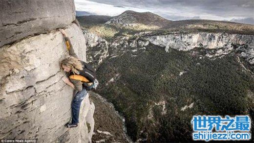 韦尔东峡谷位于法国南部普罗旺斯地区,当然它不是一枝独秀的之所以这么险峻都是因为它的两位邻居一座是阿尔卑斯山,另外一座是普罗旺斯山,在他们俩之间绝不会少了深度它是世界上最深的峡谷之一在欧洲被称为大峡谷,供攀岩者攀爬的高度大约有300米,但他们大多都是带上保护装置的不像图中这位小伙不需要保护。