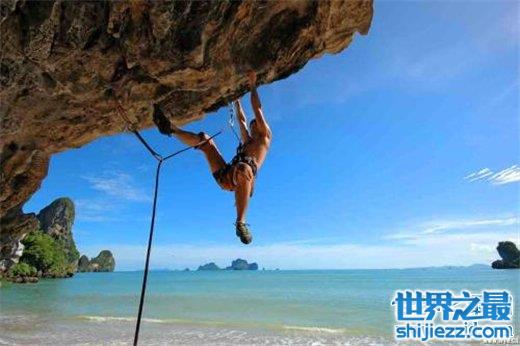 泰国甲米的攀岩地区和其他地方不一样它的攀岩山脉位于海中央而且不止一个可攀岩的山脉海里小岛众多根据难度划分了不同路线,在碧蓝色的海面上攀岩虽然不危险但想想下面还有些食肉的鱼类还是很刺激的。