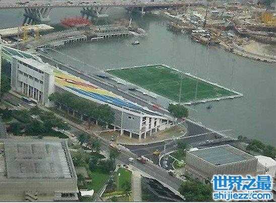 虽然这个体育场是水上的建筑但有一半是依靠在陆地上的这些都是因为体育场自身的面积和重量,这个体育场是世界上最大的水上露天体育场,长120米,宽83米,最大可以同时容纳3万人观看比赛,在水里看比赛想想都刺激。