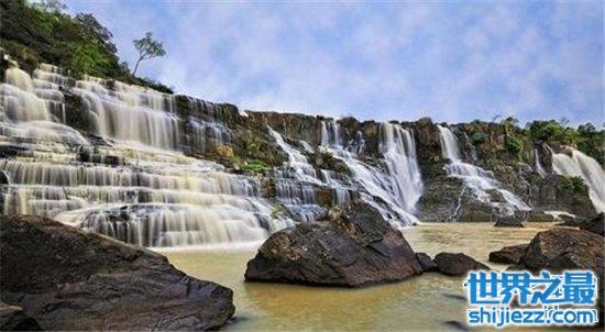 是越南最大的瀑布,瀑布类型属于台阶式,瀑布在30米突然落到七层,接着落在一个巨大的游泳池里,声音像雷鸣轰顶一样。Pongour瀑布非常迷人,不过气势最宏大的是雨天,大量的水都会用更加大的力量落到台阶上,这时候瀑布就会成为一个半圆形。