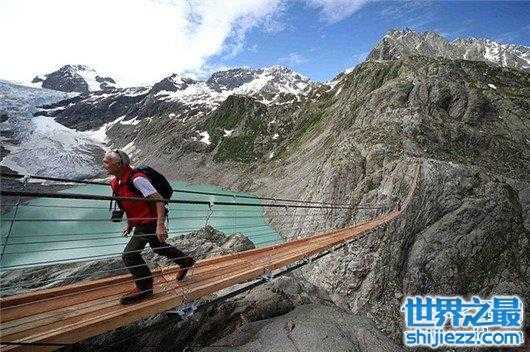 瑞士的trift桥就算是在晴朗无风的天气里,你也还是会感到十分惧怕,更别说刮风下雨的时候了,那悬索桥会来回晃荡,最高幅度可达二十多英尺,如果你是一个足够勇敢的人那么这个桥非常值得一去,因为在桥上有瑞士阿尔卑斯山脉最美的视角点。