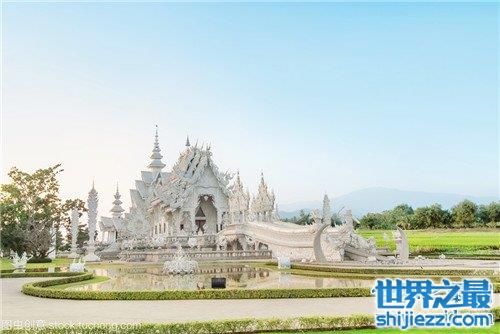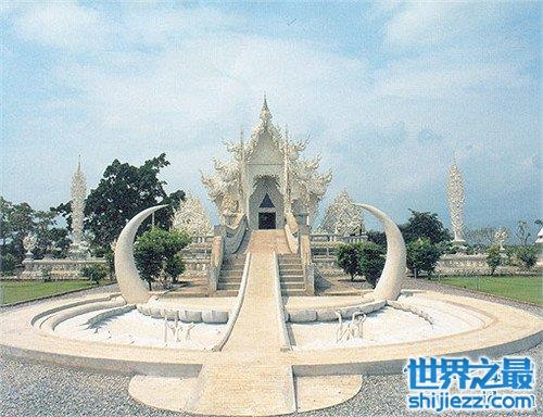 白庙,听起来像不像是美国的白宫呢?没错,它与美国的白宫差不多都是白色的建筑,这座寺庙是泰国比较新的一个寺庙之一了,它建立于一九九七年,远远的望去,像是从画里面出现的一个童话城堡了,它里面有一个非常大的亮点,那就是重生循环的桥梁了。