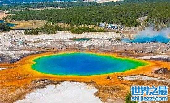 大棱镜彩泉,位于美国著名的黄石国家公园,这个湖常年有蒸汽喷出,具有多种矿物质,元素的组成,从高空来观看这个湖,它就像一颗美丽的宝石,因为富含多种矿物质元素的原因,导致她每个季节都在变化颜色,所以它也被称为彩色湖。