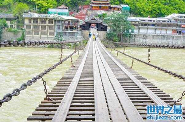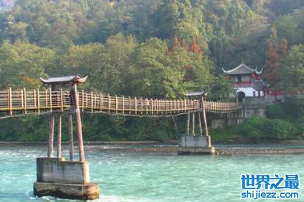 安澜桥是位于四川都江堰首鱼嘴处,横跨在内江和外江分水处的全长达500米的中国著名五大古桥之一,最早建于宋代之前,在明末时期被毁于战火,在清朝嘉庆八年才重新完成这条索桥的修建。