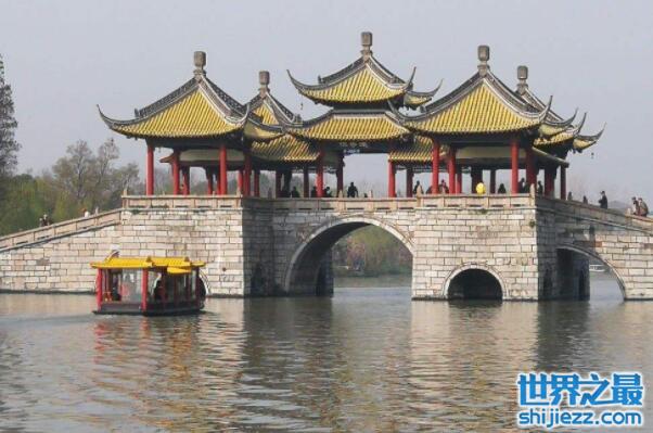 五亭桥位于我国江苏省扬州市,是建设在扬州瘦西湖水道之上,是仿北京北海的五龙亭和十七孔桥而建的。目前这个有着莲花桥别称的桥梁,目前就位于瘦西湖景区内。