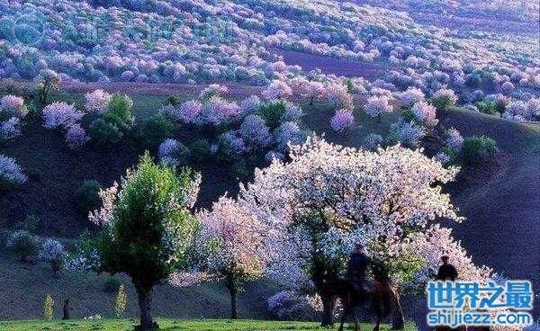 位于新疆伊犁新源县的杏花沟,是一个山清水秀的仙境。每年4月中旬,每一株杏树都露出了一年中最恬美的笑容,远远望去,像一层层粉白的瑞云轻轻漂浮在一道道曲线美的青山上。