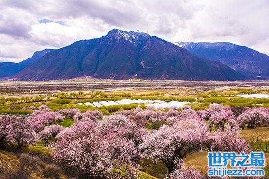 3月的林芝桃花沟,寒意未尽,却已是花的海洋。远方的雪峰还有皑皑白雪,桃花已如醉霞绯云般地争相斗艳。在雄伟的雪山怀抱中,粉红色的桃花无限温柔可爱。迷人的桃花,映着蓝天,是美丽的。