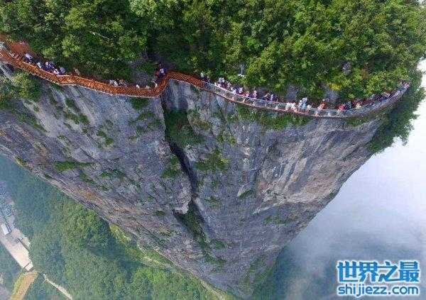 这座玻璃桥横跨张家界大峡谷的两座悬崖。它长410英尺(430米),宽20英尺(6米),高度984英尺(300米)。这座桥由以色列建筑师海姆·多坦(Haim Dotan)设计,每次可容纳800人。它提供世界上最高的蹦极,甚至可以作为时装秀的跑道。