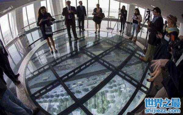 这座130年历史的桥横跨泰晤士河,它的双塔之间悬挂着一条透明的走道。它允许游客凝视138英尺(42米)以下的道路和河流。大桥高层走道上的玻璃地板每条重661磅(300公斤)。