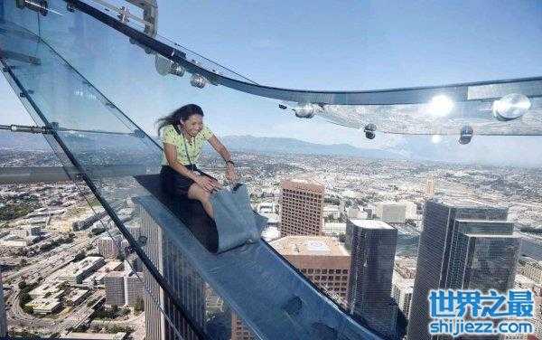 Skyslide是一个玻璃滑道,长45英尺(13.7米),高度为1000英尺(305米),位于美国西海岸最高的美国银行大厦外面。 通过滑道,游客可以在几秒钟内从摩天大楼的70楼到69号。这张幻灯片是由三层玻璃制成的,它可以承受高达每小时100英里(每小时161公里)的飓风。