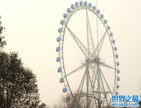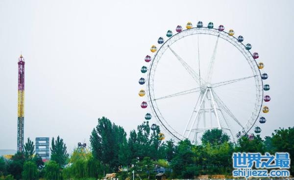 世纪欢乐园摩天轮,吊舱有56个,重达数千吨。在被郑州市列入夜景照明工程后,郑州市市政部门对其进行了精心设计,在该摩天轮上安装了装饰灯。该灯由2000多根彩色灯管围绕直径90多米的摩天轮组成,中间的六根菱形支柱也被变幻的灯管装饰,无论是从高度还是灯管的长度。