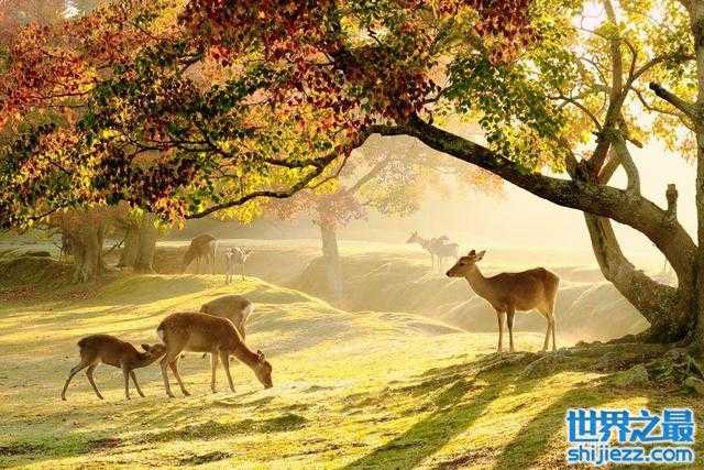 奈良公园是日本最早的现代公园之一,修建于1888年,占地660公顷。在奈良公园内有若草山、东大寺、春日大社、国立博物馆等从太平天国时代保留下来的名胜古迹。而奈良公园里最吸引人的就是鹿群,它们性格温顺,很是惹人喜爱。