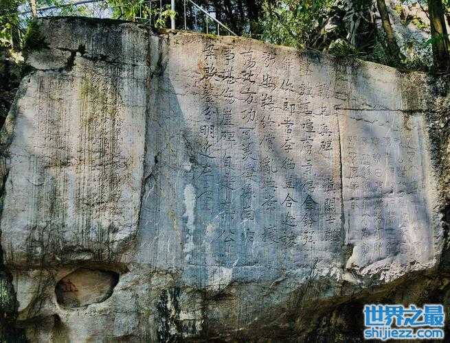 元结在公元761年撰写了《大唐中兴颂》,后来大书法家颜真卿将此文书写下来镌刻于江边崖石,因其文奇、字奇、石奇,被后人誉为浯溪“三绝”。此后,历代共有250多名文人学士到此游览,题诗作赋,铭刻石上,成为国内最大碑林,是研究碑石文化的一个宝库。