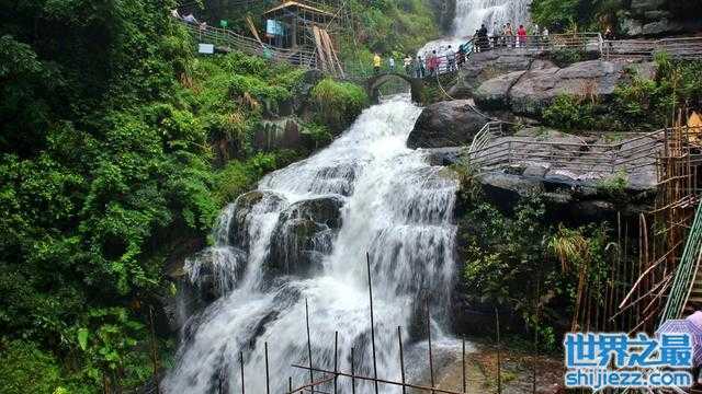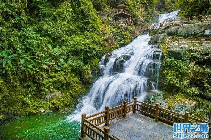 瀑布群镶嵌在深山峡谷中,两边山峦满目苍翠,万木葱茏,古藤相绕、翠竹遮天,宛如世外桃源。峡谷巨石嶙峋多姿,鬼斧神工,奇花异木,各放光彩,2小时的游程足可饱览天下瀑布之奇观。