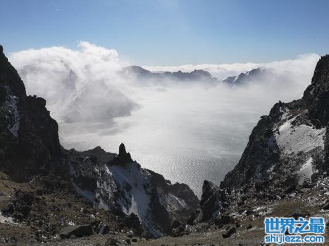 长白山天池又称白头山天池,坐落在吉林省延吉市长白山风景区境内,是中国和朝鲜的界湖,也是中国最大的火山湖、世界上最深的高山湖泊,其南北长约4400米,东西宽约3370米,池水的海拔高度为2189.1米。天池被16座山峰环绕,冬冻冰面雪一样的白;夏融则池水比天还要蓝,周围16座奇异峻峭的山峰倒映湖中,波光峦影,蔚为壮观,而天池就像一块瑰丽的碧玉镶嵌在雄伟的长白山群峰之中,令人叹为观止。