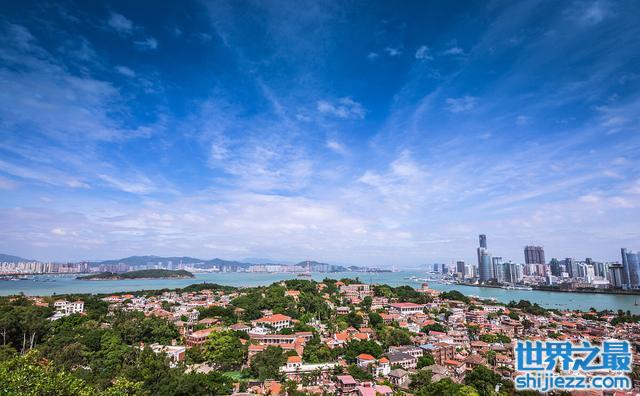 鼓浪屿地处厦门西南禺的一座小岛,面积1.77平方千米,以700米宽的海峡与市区相隔。岛上四季如春,岛上树木丛生,丘陵起伏,有海上花园的美称,因为岛上有一中空巨石,海浪拍击声如鼓鸣而得名鼓浪屿。