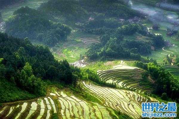 紫鹊界梯田景区,位于娄底市新化县水车镇。紫鹊界梯田总面积达8万多亩,核心景区梯田面积超过2万亩。紫鹊界梯田历史悠久,肇始于先秦时期,距今已有两千多年历史,中国古代渔猎文化和稻作文化相融合的重要文化遗存;2014年入选首批世界灌溉工程遗产名录。