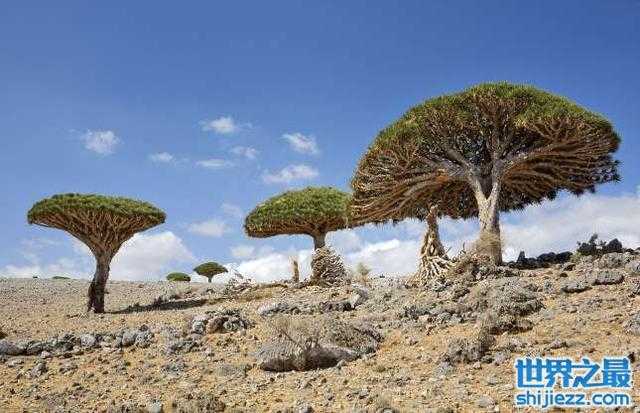 由于其红色树液而被称为龙血树,这些生长缓慢、外形怪异的树木在也门共和国的索科特拉岛上提供了一种超现实的吸引力。