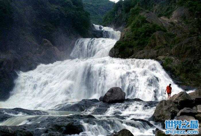 其中最有名的便是第一级瀑布——龙潭瀑,瀑高46.7米,宽76米,站在观景台上,飞瀑腾空而下直入眼帘,龙潭上空茫茫水汽,如雾似雨,尤为壮观。