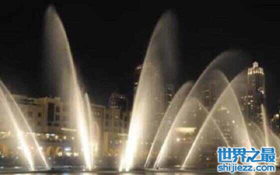 迪拜喷泉是世界上最大的音乐喷泉,它的总长度为275米,最高可以喷到150米,十分于一栋50层楼的高度。该喷泉会喷射2、2万加仑的水,并配有6600个灯光以及50个彩色投影机。喷出的水柱有1000多种变化,每一场使用的音乐不同、水柱的舞姿也不同。