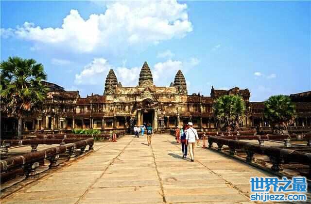 吴哥窟,又称吴哥寺,位于柬埔寨,被称作柬埔寨国宝,是世界上最大的庙宇类建筑,同时也是世界上最早的高棉式建筑。吴哥窟建造于1113年,距今已有900多年的历史,经过三十多年才完工,其遗址占地面积达400多平方公里,包括森林地区,于1992年被列为世界文化遗产。