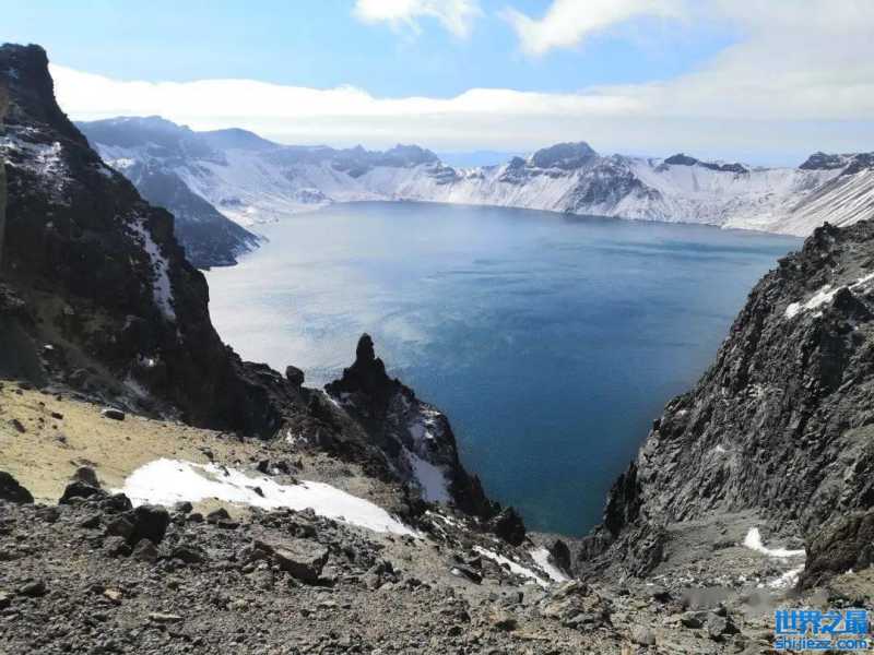 天池位于长白山主峰火山锥体顶部,是一座火山口,经过漫长的年代积水成湖。天池像一块瑰丽的碧玉镶嵌在雄伟的长白山群峰之中,它是我国最高最大的火山口湖泊。