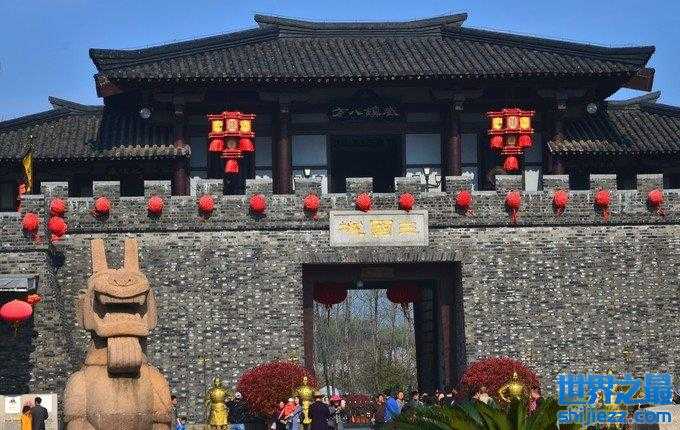 三国城坐落在葱茏苍翠的军嶂山麓、风景秀丽的太湖之滨,是中央电视台为拍摄八十四集电视连续剧《三国演义》而兴建的大型影视文化景区,“刘备招亲”、“火烧赤壁”、“横槊赋诗”、“草船借箭”、“借东风”、“诸葛吊孝”、“舌战群儒”等十多集的重场戏均在此拍摄。