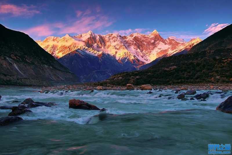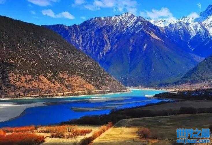 雅鲁藏布江的平均海拔在三千米以上,是世界上最高的河流,在它的下游围绕喜马拉雅山东部的最高峰,形成一个马蹄形大拐弯,在青藏高原上切割出一条长达五百公里的巨大峡谷就是世界最长最大的雅鲁藏布大峡谷。