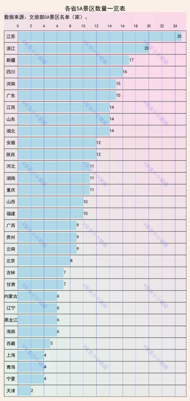 江苏和浙江,胜在市市皆有5A级景区,所以累积下来的数量,排名全国前二。