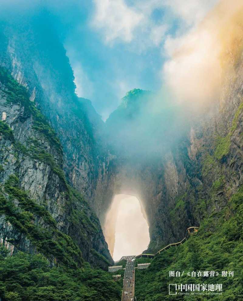 一根根石英砂岩柱间因飘绕着白色流云,更加出尘与飘浮。虽然四周都是绝壁,远看孤峰高耸,但山顶其实也相对平坦,搭好帐篷露营,坐拥无敌风景,这是张家界独有的露营方式。
