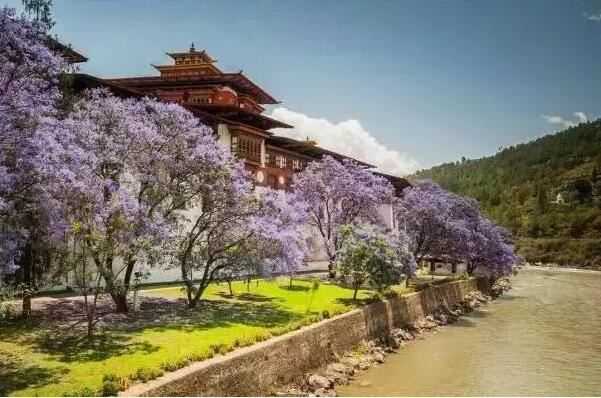 不丹位于中国和印度之间喜马拉雅山脉东段南坡,到了四月份,正是普那卡宗的蓝花楹开的最好的时候,人们在花树下经过,踏进宗堡、四方求法。如果是一个人去,站在白色高墙下,伴随熹微的晨光,微风拂过落英缤纷,就仿佛下了一场漫天紫雨。