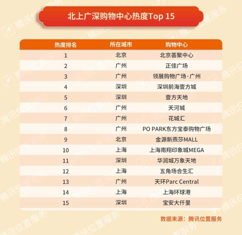 人口流动性增强,带动城市消费回暖,大数据也发现了大家逛商场的热情高涨。腾讯位置服务对四座一线城市三十多家热门商场进行了观测,15座人气最高的购物中心,广州数量占了6座,深圳占了4座。北京荟聚中心、广州正佳广场、深圳前海壹方城、上海南翔印象城MEGA等成为各个城市热度较高的购物和消费场所。