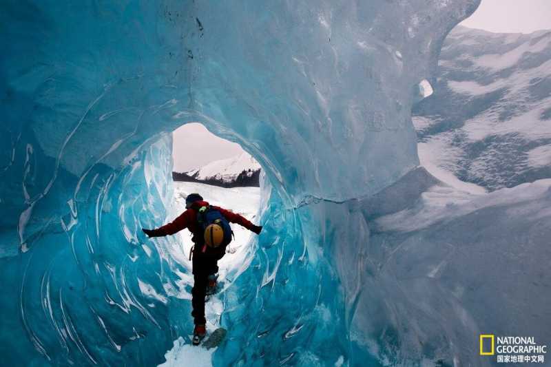 一名徒步者在探索门登霍尔冰川的冰洞。摄影:MELISSA FARLOW, NAT GEO IMAGE COLLECTION
