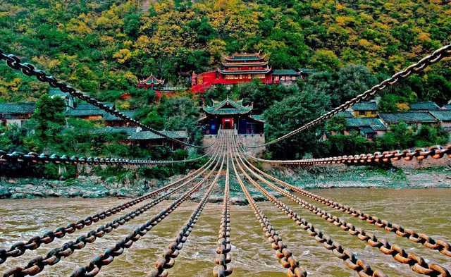 泸定桥又称铁索桥,始建于1705年,位于四川省甘孜藏族自治州泸定县,因“飞夺泸定桥”战斗而闻名中外。泸定桥长103米,宽3米,13根铁链固定在两岸桥台落井里,共有12164个铁环相扣,全桥铁件重40余吨。桥两岸的桥头古堡为传统木结构古建筑,为中国独有。泸定桥是中国工农红军在长征途中最为重要的一场战役之地,也是重要的历史纪念地和红色旅游景区。