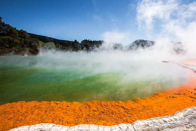 详细介绍:香槟池位于新西兰,其形成是因为900年前的火山爆发。这个温泉中会释放出非常多的二氧化碳,看起来就像香槟酒中的起泡一样,也由此得名。