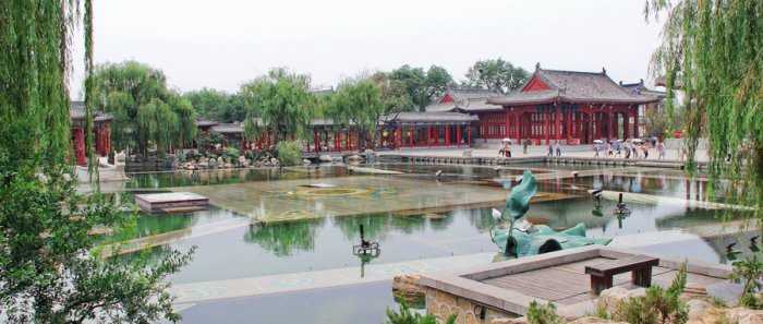大唐芙蓉园位于西安市城南的曲江开发区,大雁塔的东南侧,是仿照唐代皇家园林式样重新建造的一个展示盛唐风貌的大型皇家园林式文化主题公园,占地面积一千多亩,其中水域面积占了三八亩,园内由紫云楼、仕女馆、芳林园等多个仿古建筑组成。