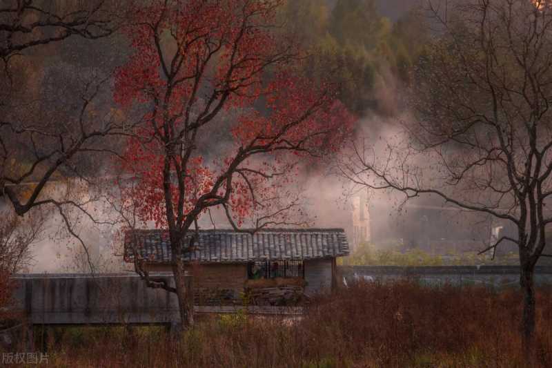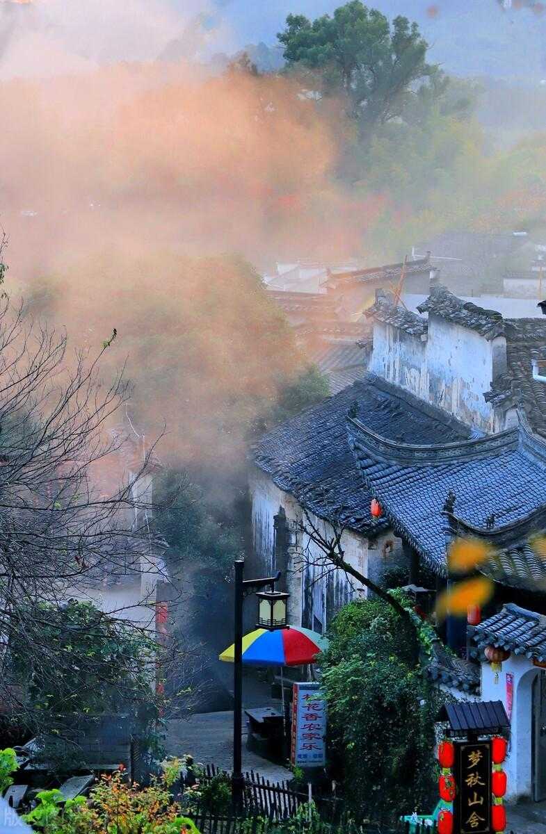 傍晚,村庄上空炊烟四起,给雾里加上了一层自然的柔光滤镜,
