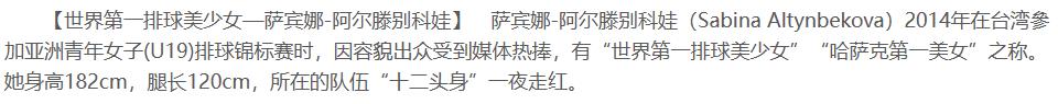 萨宾娜·阿尔滕别科娃出生在哈萨克斯坦,是她们国家非常著名的女排运动员。