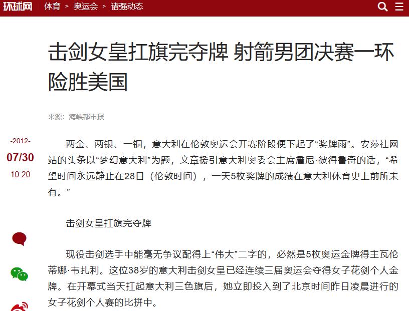 原文刊载于环球网2012-07-30关于“击剑女皇扛旗完夺牌 射箭男团决赛一环险胜美国”