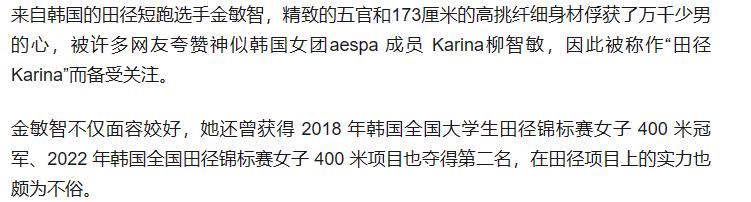 这位名叫金敏智的运动员,来自韩国,是一名田径短跑选手,人家不光五官长得精致,身高也是非常的出挑,1.73米真是纤细又高挑。