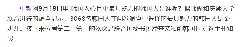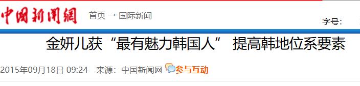 原文刊载于中国新闻网2015-09-18关于“金妍儿获“最有魅力韩国人” 提高韩地位系要素”