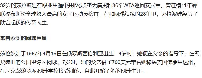 莎拉波娃1987年在俄罗斯出生,4岁在父亲的指导下就开始打网球了。