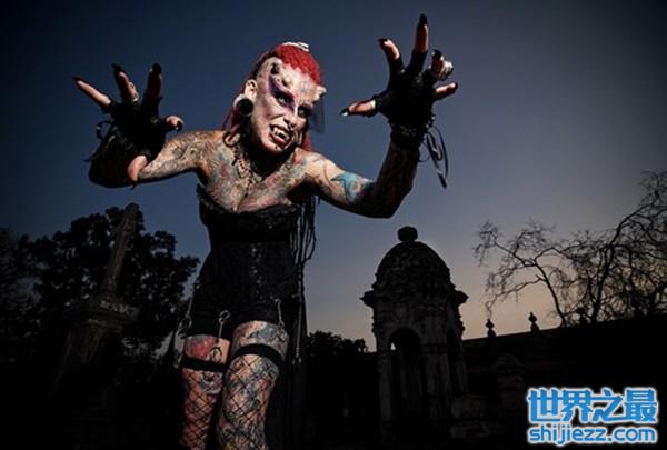 你看,就像一个真实的吸血鬼出现在我们面前。她是一个墨西哥女人,身体几乎全部都是纹身,牙齿也做过,钛刺被插入到她的头部,做一系列的手术只是为了达到可观的预期外观,但是很少有人能够欣赏的来。