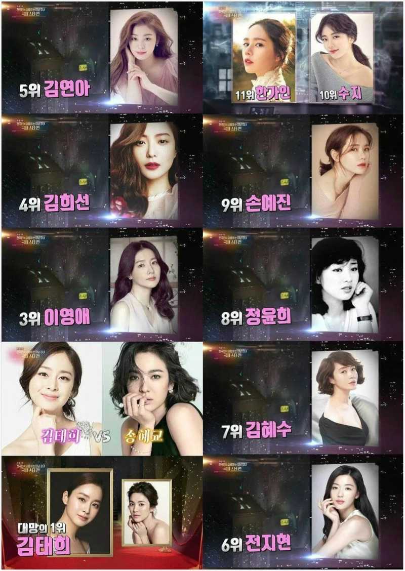 韩国作为全球娱乐产业最发达的国家之一,对于女艺人的要求是相当高了,近日,韩国KBS文化研究所公布了一份最新韩国女艺人美女排行榜,抛开一切粉丝打榜投票行为,采用主观式问卷调查的方式,极具真实性。