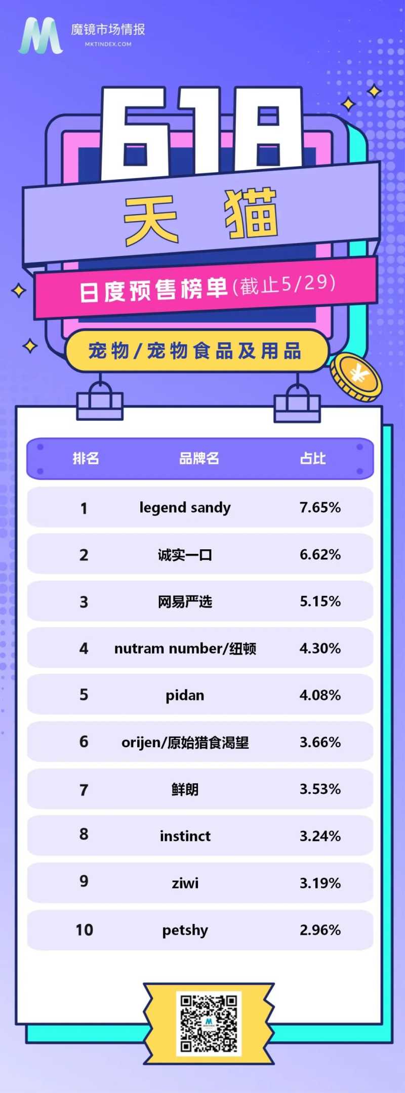 今天,魔镜市场情报将为大家盘点一下母婴、宠物行业中,天猫平台截至5月29日累计预售额品牌排行。