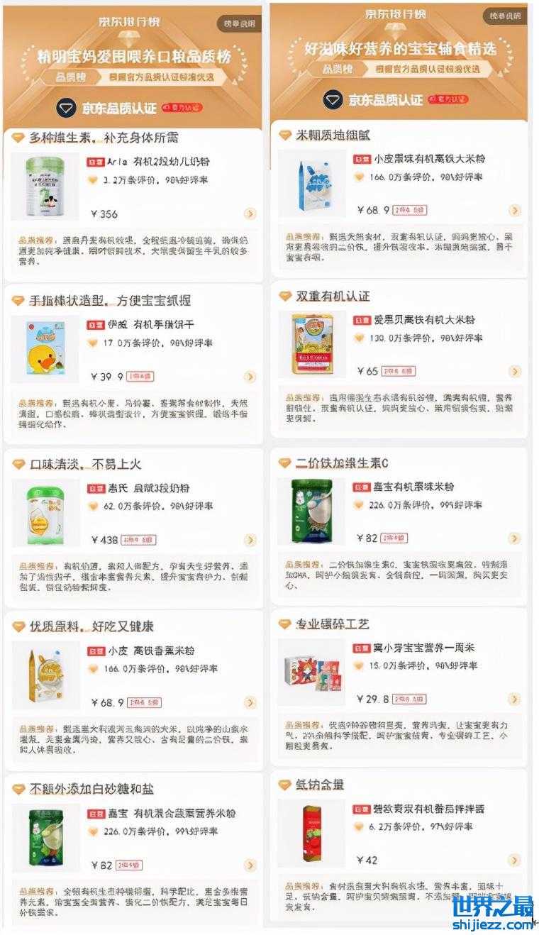 该榜单榜是京东未成年人保护专项的一个子项目,共分为“精明宝妈爱屯喂养口粮品质榜”、“好滋味好营养的宝宝辅食精选品质榜”、“实用安全的宝宝用品品质榜”三大榜单,每个榜单分别有15款商品上榜,惠氏、飞鹤、昆塔斯等知名母婴品牌上榜。而从上榜商品也可以发现母婴行业的一些风向和趋势。