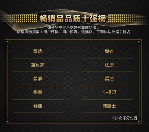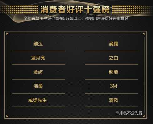 其中在家清纸品畅销品质榜单中排名前十的分别是维达、蓝月亮、碧浪、得宝、舒洁、奥妙、汰渍、雷达、心相印、威露士。